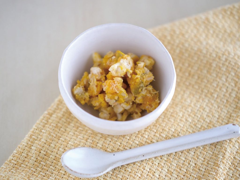 練りごまと黄粉の風味を活かし、豆乳を加え加熱する事でとろみがつきかぼちゃと魚が和えやすくなります。