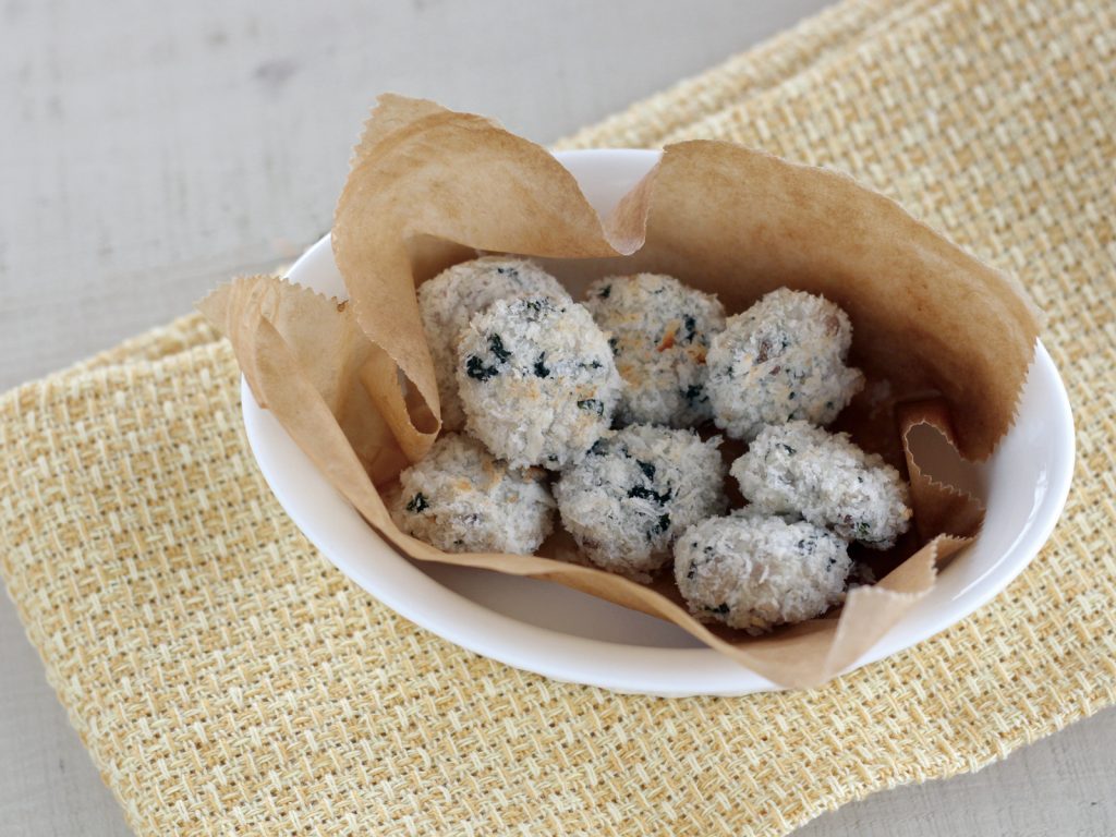 1.ボウルでパン粉以外の材料を混ぜ合わせ、小さい俵状の大きさに丸め、周りにパン粉をまぶす。
