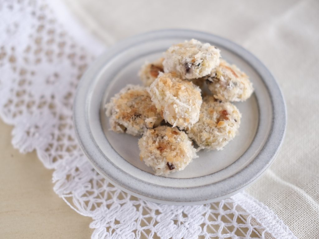 成形した生地の周りにつなぎの卵はつけず、パン粉をまぶして焼くので油っぽくならず仕上がります。
