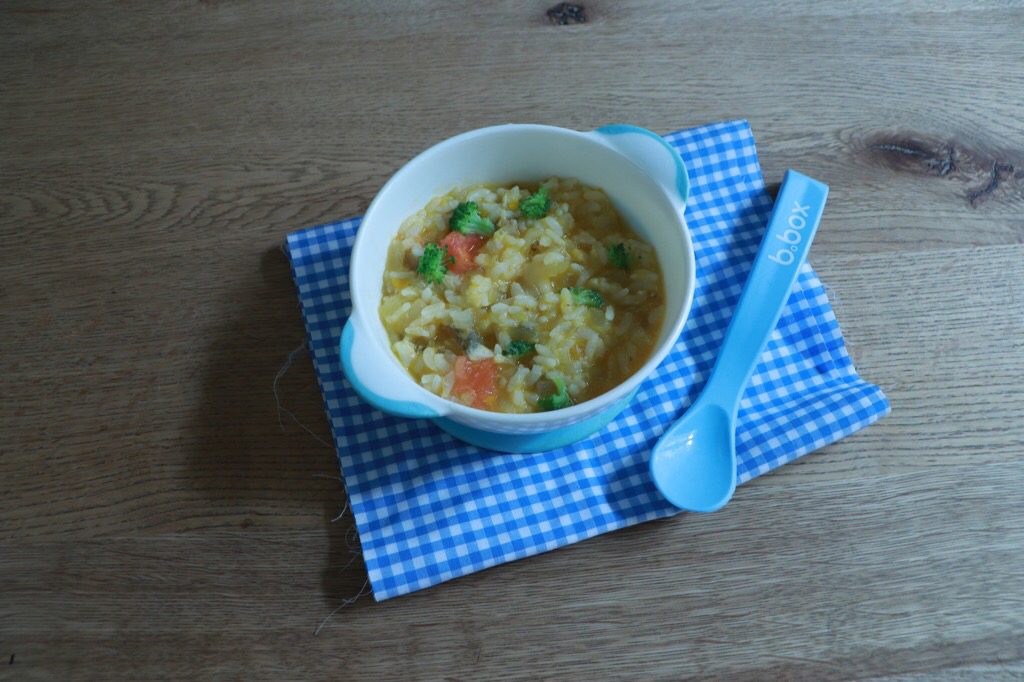 カレー粉をごく少量でご飯の固さを調整すると後期からご利用いただけます。カレー粉をかつお節に変え和風味に、またごま油を少し垂らして中華風にと、色々アレンジ多様できるリゾットです。